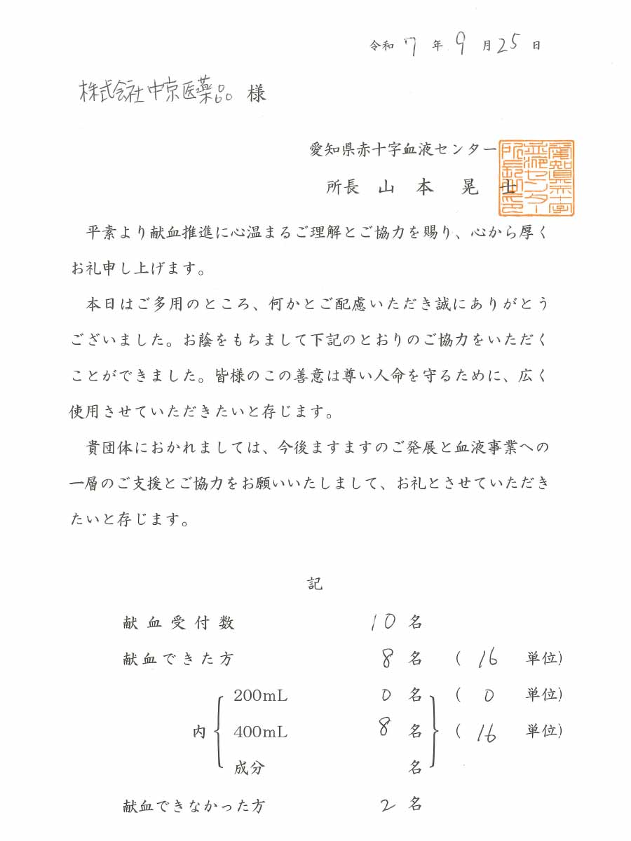今回は、2025年9月25日(木)に本社とアクアマジック半田WSの従業員が愛知県赤十字血液センターの献血に参加し、8名が合計3,200mlを献血しました。